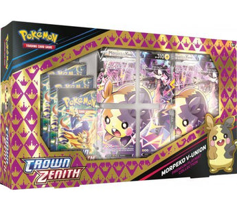 In deze box vind je vijf prachtige promo kaarten van Morpeko V-UNION! Vier Morpeko V-Union promo kaarten die samen één gigantische Pokémon vormen, de oversized kaart van Morpeko V-UNION. Bovendien bevat deze box vijf Crown Zenith booster packs, een supporter kaart van Professor Burnet en een premium playmat!