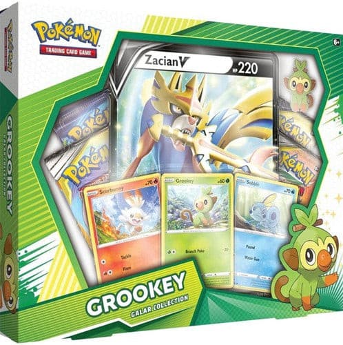 Speciale Pokémon TCG box met Pokémon Grookey, Scorbunny en Sobble die de Galar region gaan verkennen! Deze box is verkrijgbaar in 3 verschillende kleuren, elk met 2 designs. Een Galar Collection box bevat 3 foil promokaarten (Grookey, Scorbunny en Sobble), 1 oversized foil promokaart (Legendarische Pokémon Zacian of Zamazenta), 4 Pokémon TCG boosterpacks, 1 pin (Grookey, Scorbunny of Sobble) en 1 codekaart voor Pokémon TCG Online.